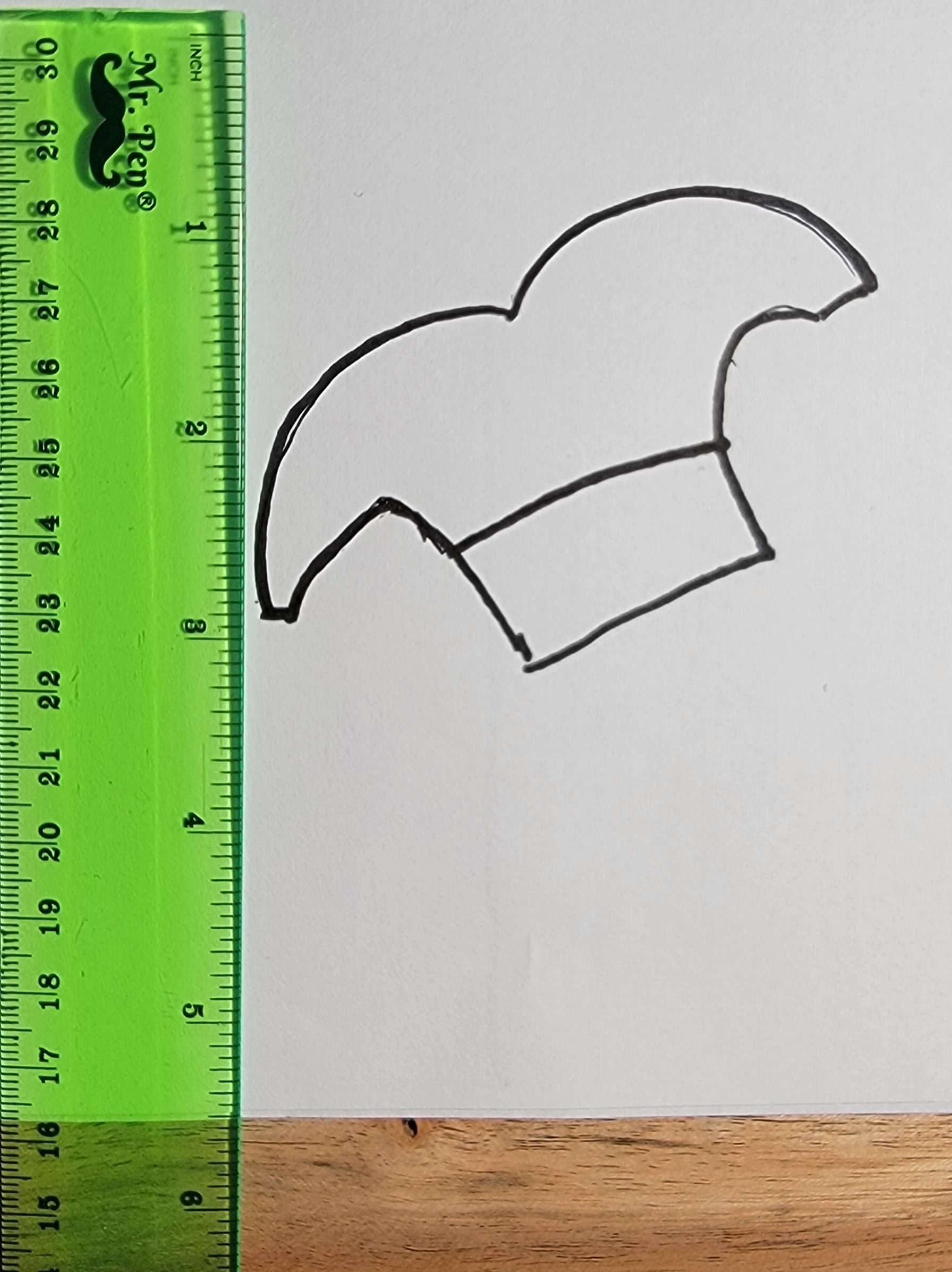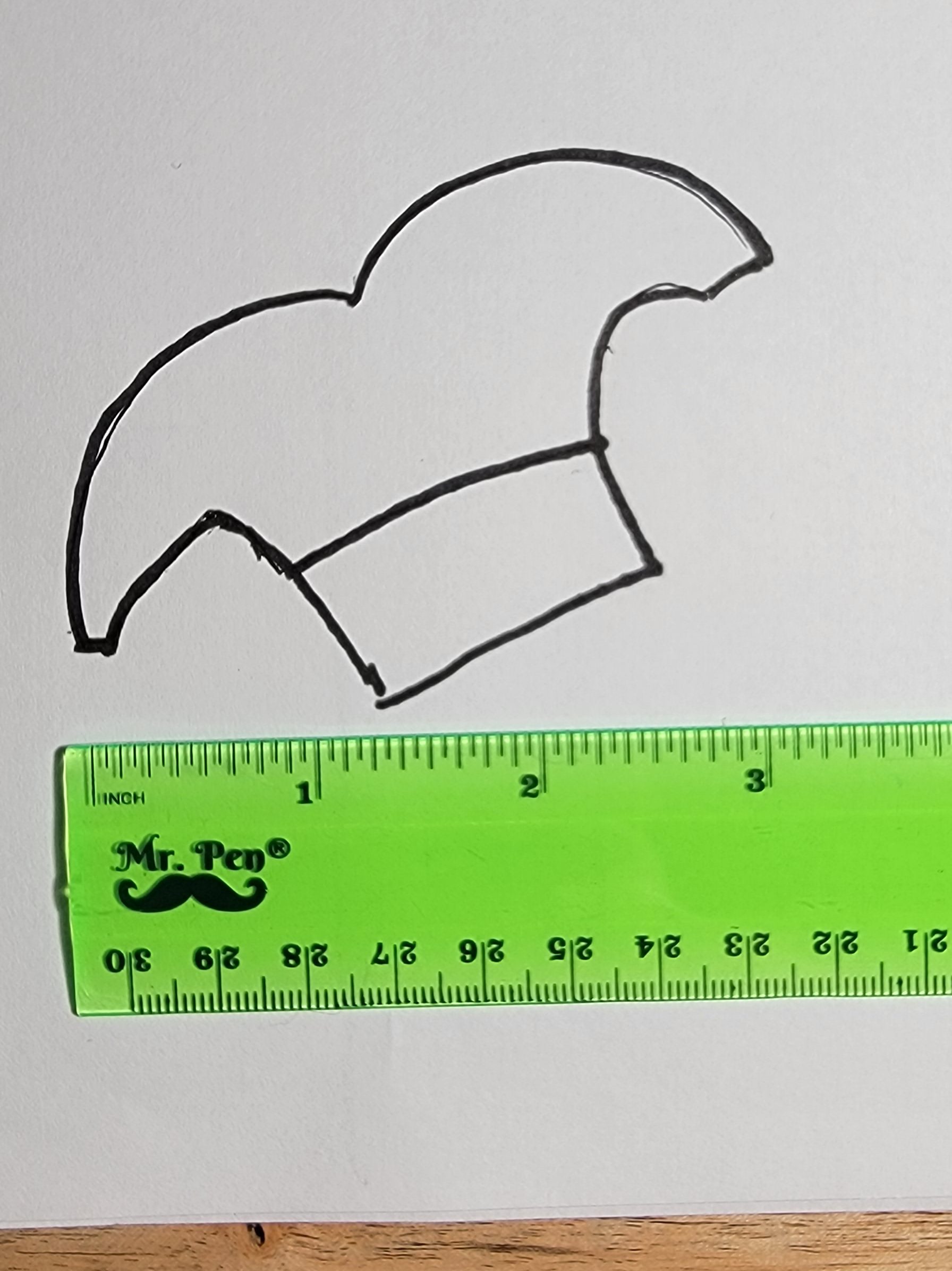 To make the hat, first you will have to cut out the pattern. The way I created this hat pattern is that I printed a photo of the original Jack in the concept art and simply cut out the hat. Then, I traced around the cut out hat to add a small seam allowance. You will just need to print out the hat pattern that I have made you below. You can right click on the image and save it to your computer or phone and then print. To make sure you have it sized the right size, I have included images with a ruler. It is up to you to figure out how to size your image for printing, but you can always put it in a Word document and simply drag the image until it is the correct or near correct dimensions. So, in short, print this image out to the correct size for making a pattern. You may need to make it bigger or smaller depending on the size of your project or your personal preferences.
