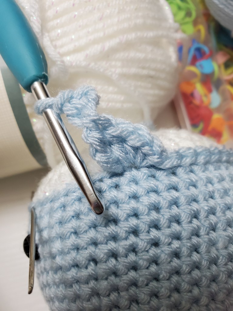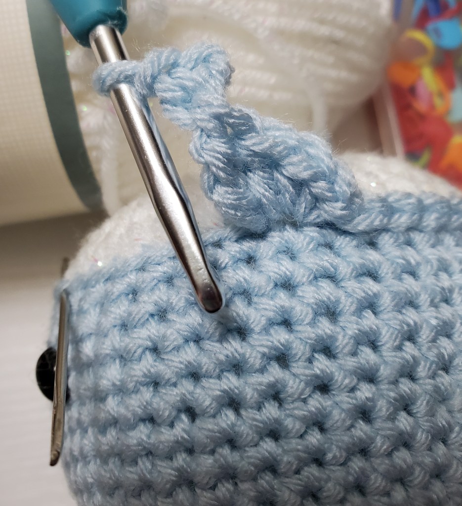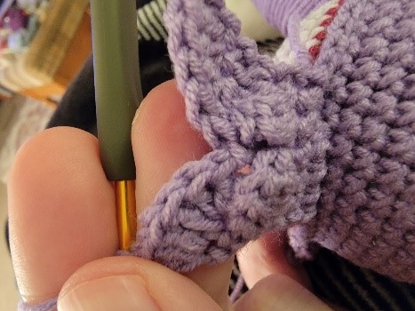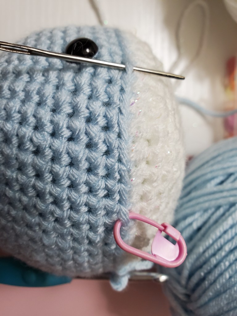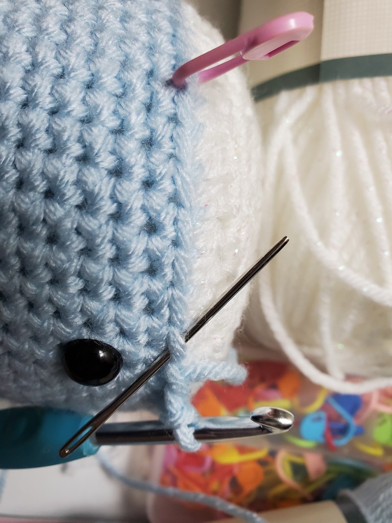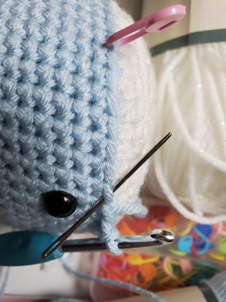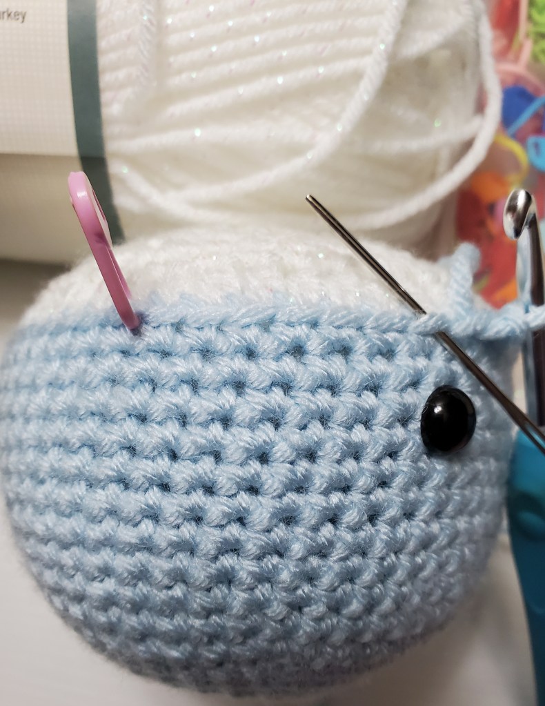 Let’s go ahead and mark our second fin too. The important thing to remember is that the fins should be opposite each other when looking down from the top of your whale. If you need to, move the stitches to where they will be placed correctly. It is more important that the fins look even and are placed correctly than the stitch counts that I am giving you.
