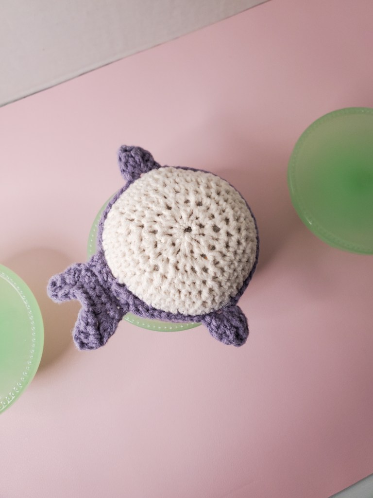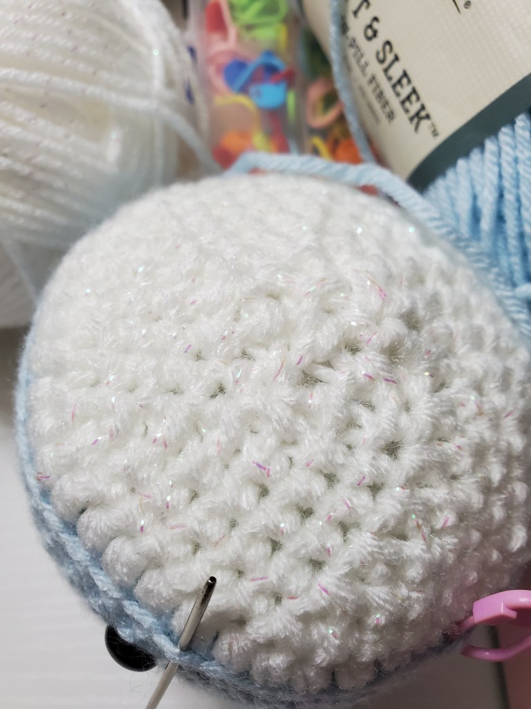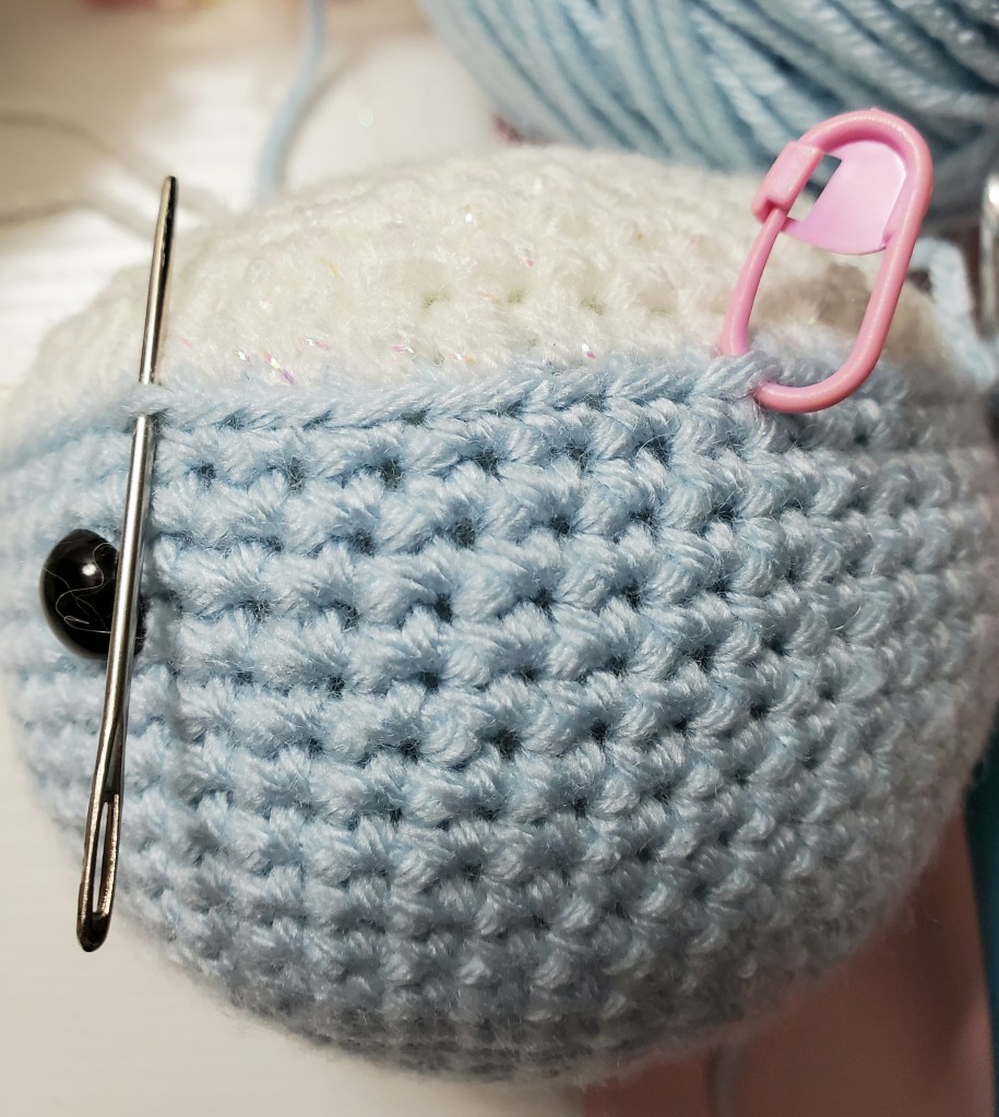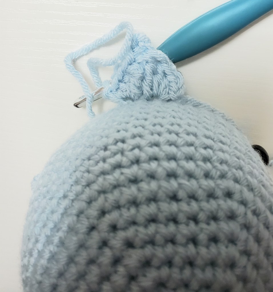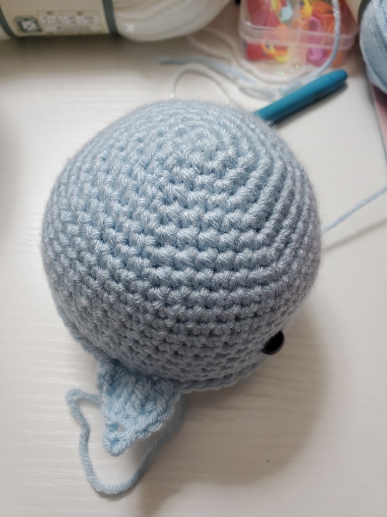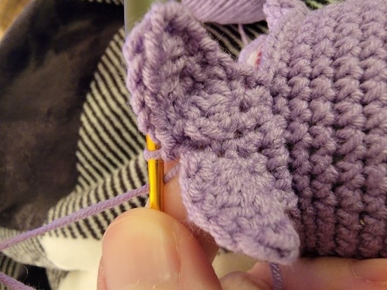 Let’s go ahead and mark our second fin too. The important thing to remember is that the fins should be opposite each other when looking down from the top of your whale. If you need to, move the stitches to where they will be placed correctly. It is more important that the fins look even and are placed correctly than the stitch counts that I am giving you.