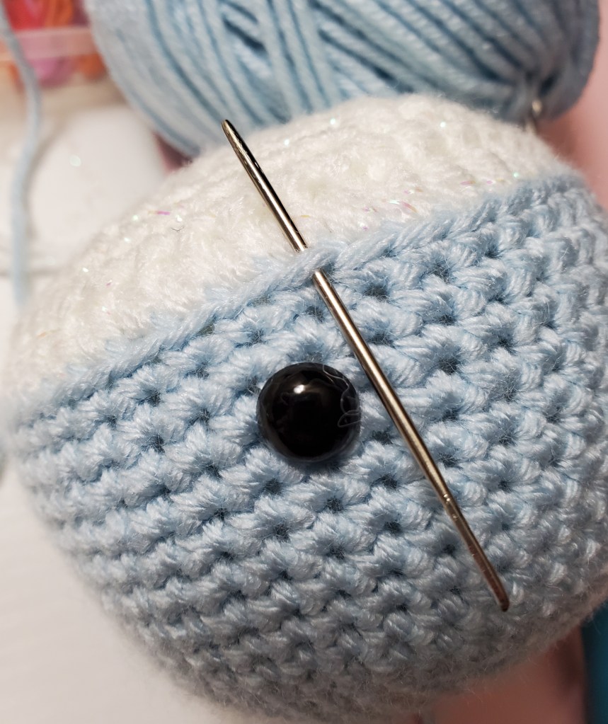 Sl st around until you are 8 stitches from the first eye. See photo.