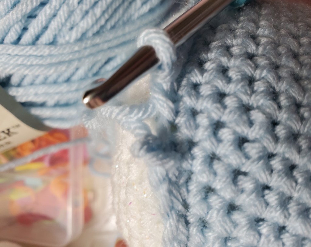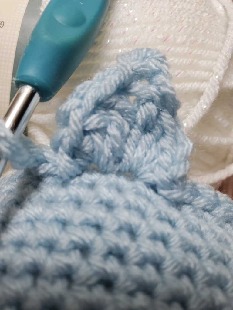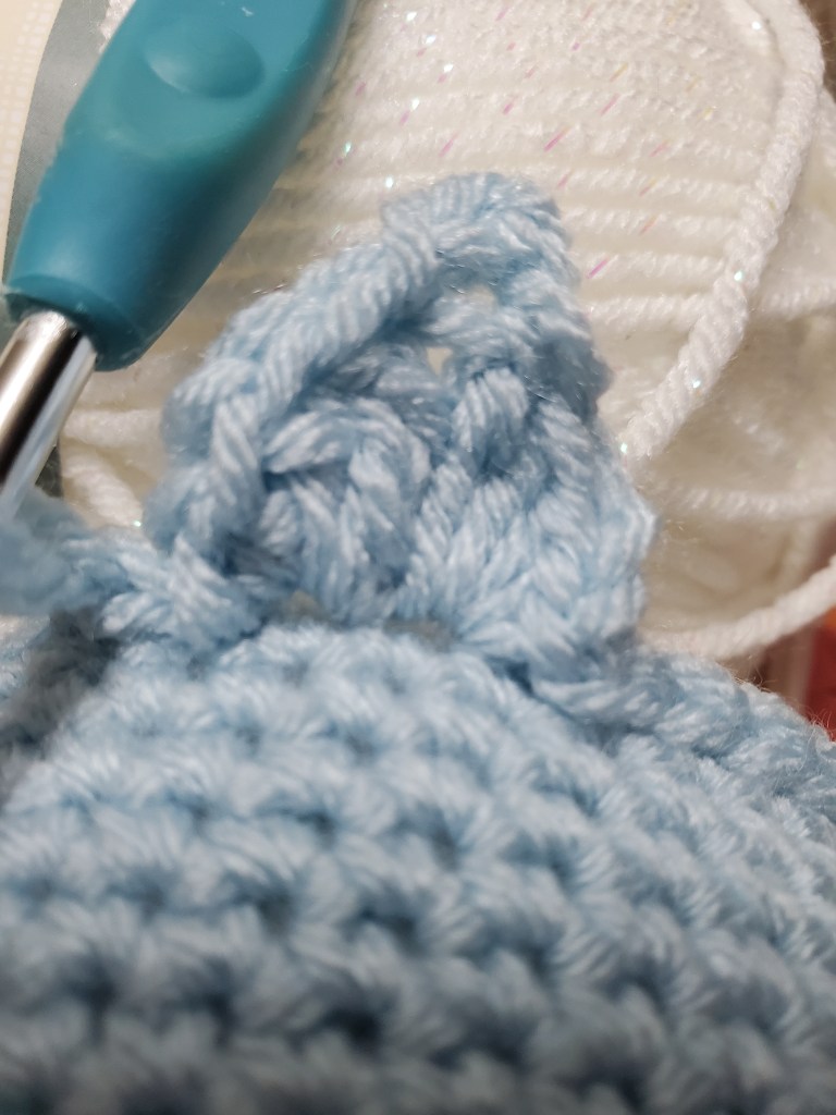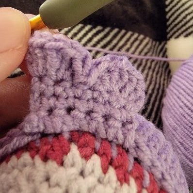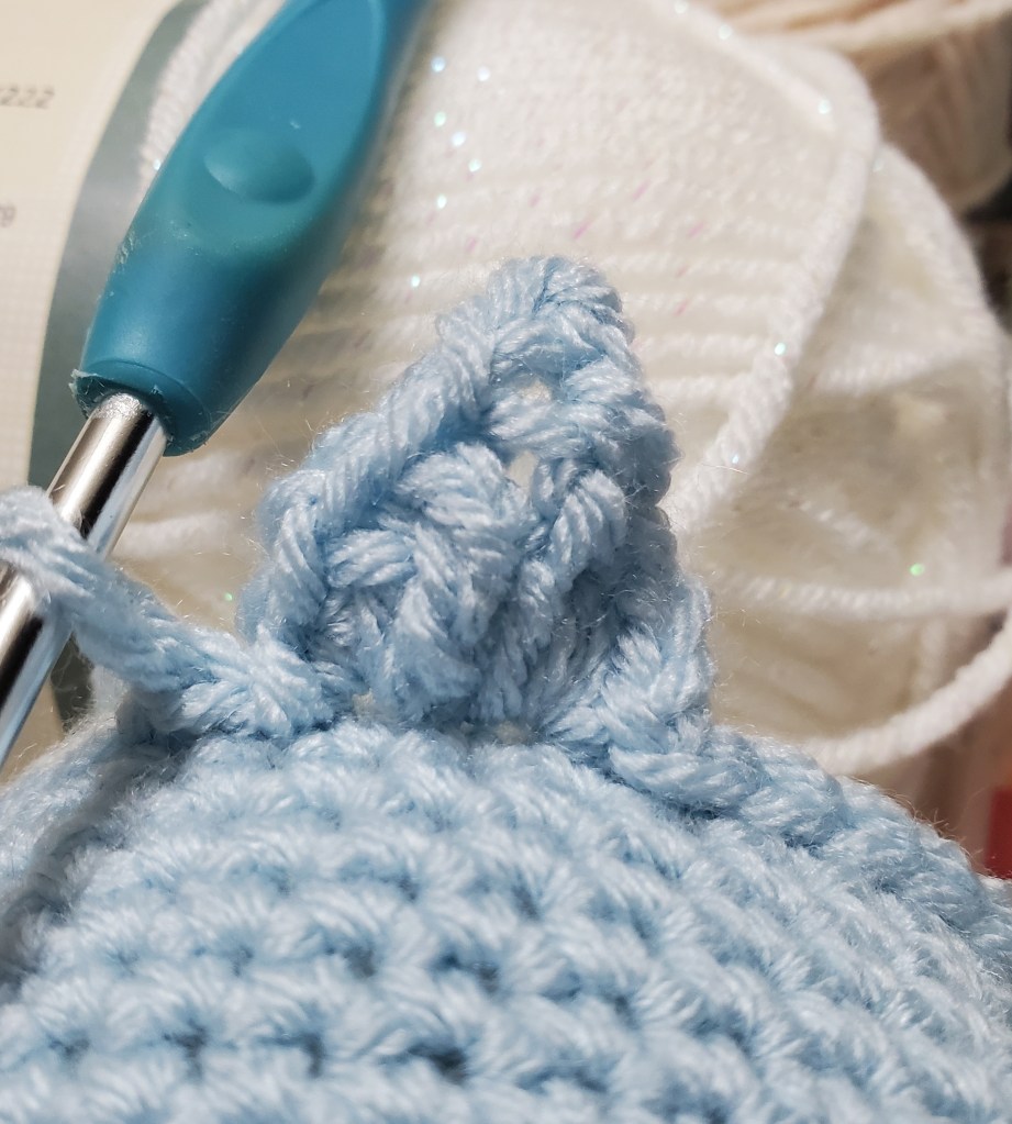 stitches, sc around next 6 slip stitches. Ch 1, turn.