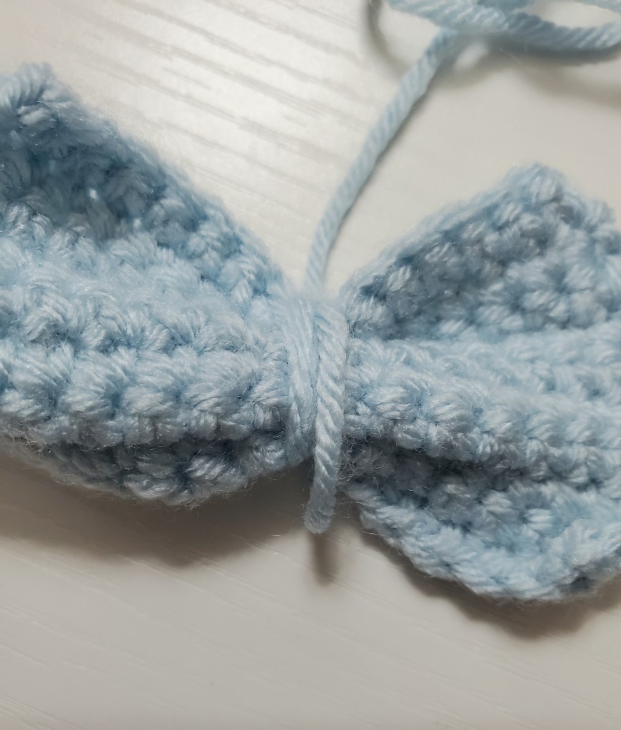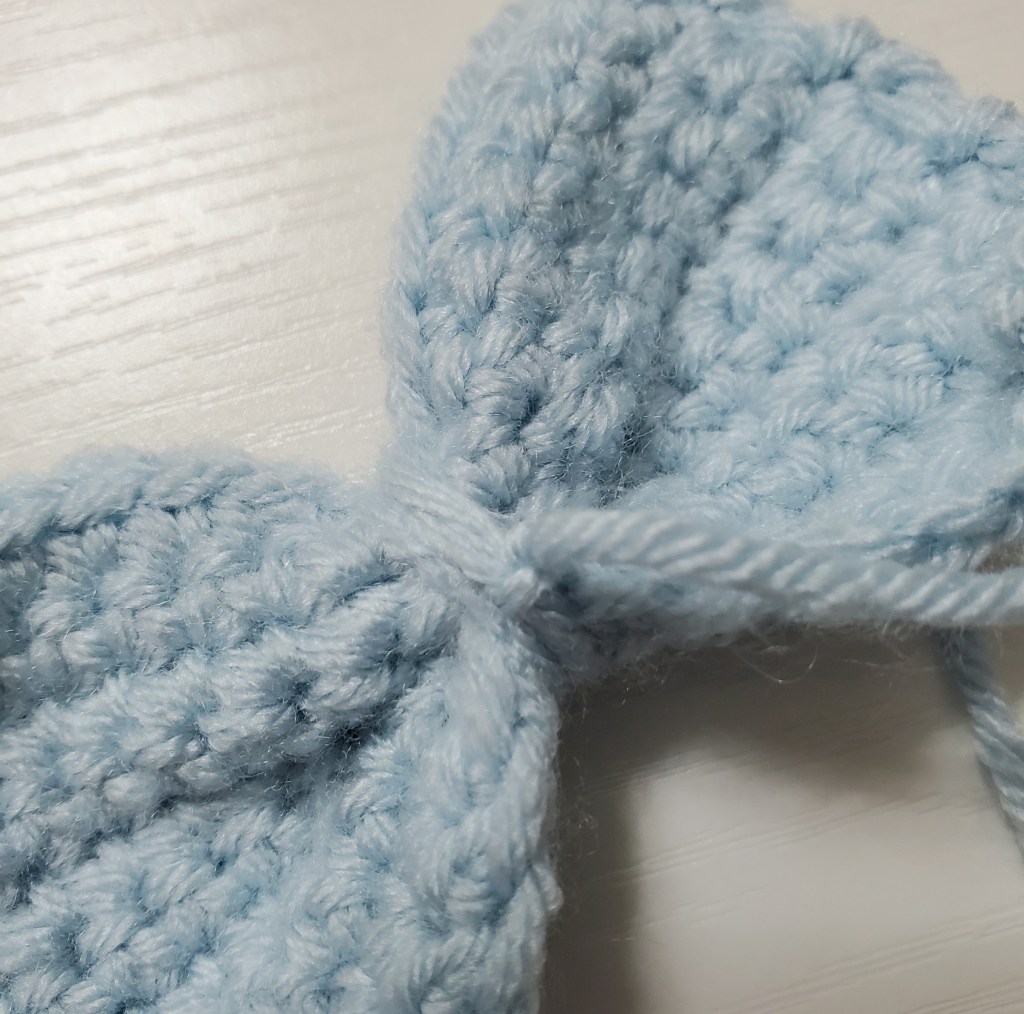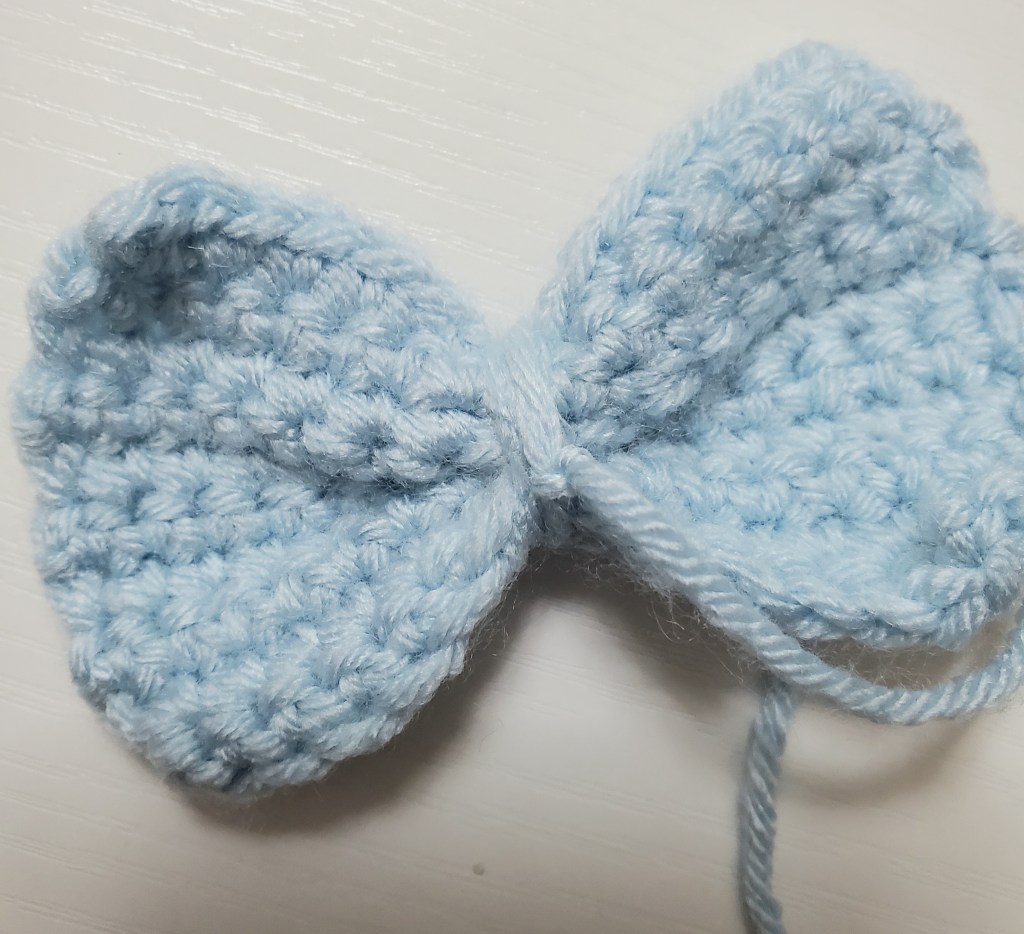 Weave the yarn from the end to the middle of the bow. Make sure you are hiding your yarn in your work. Then, tie a knot. You should have something that looks like this: