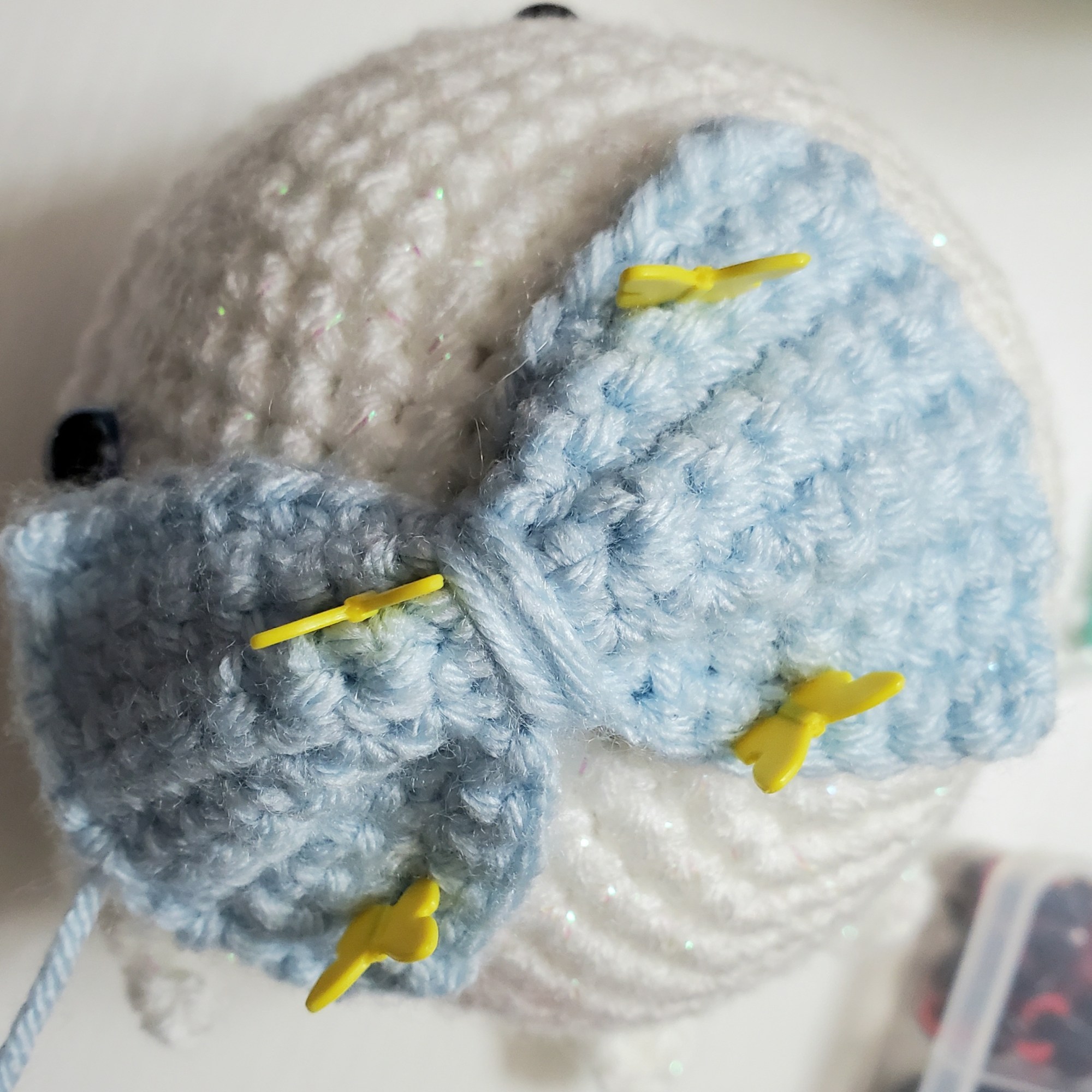 Now, use the photos below to attach the bow to your whale using straight pins.
