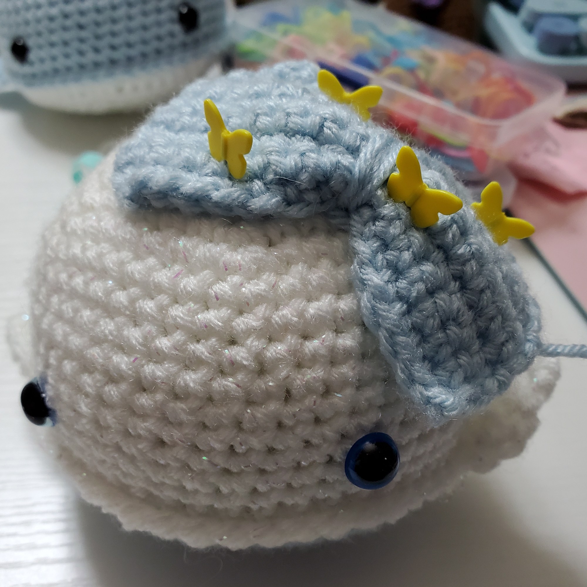 Wow! How are we already on Lesson 6? This series has gone by really quickly. Today, we will add the finishing touches to our whale! Remember that bow you crocheted at the beginning? You will now attach it to your whale’s head. This is the step where you can customize the base whale and really make it your own. Never be afraid to explore, play with color, and have fun with your projects!