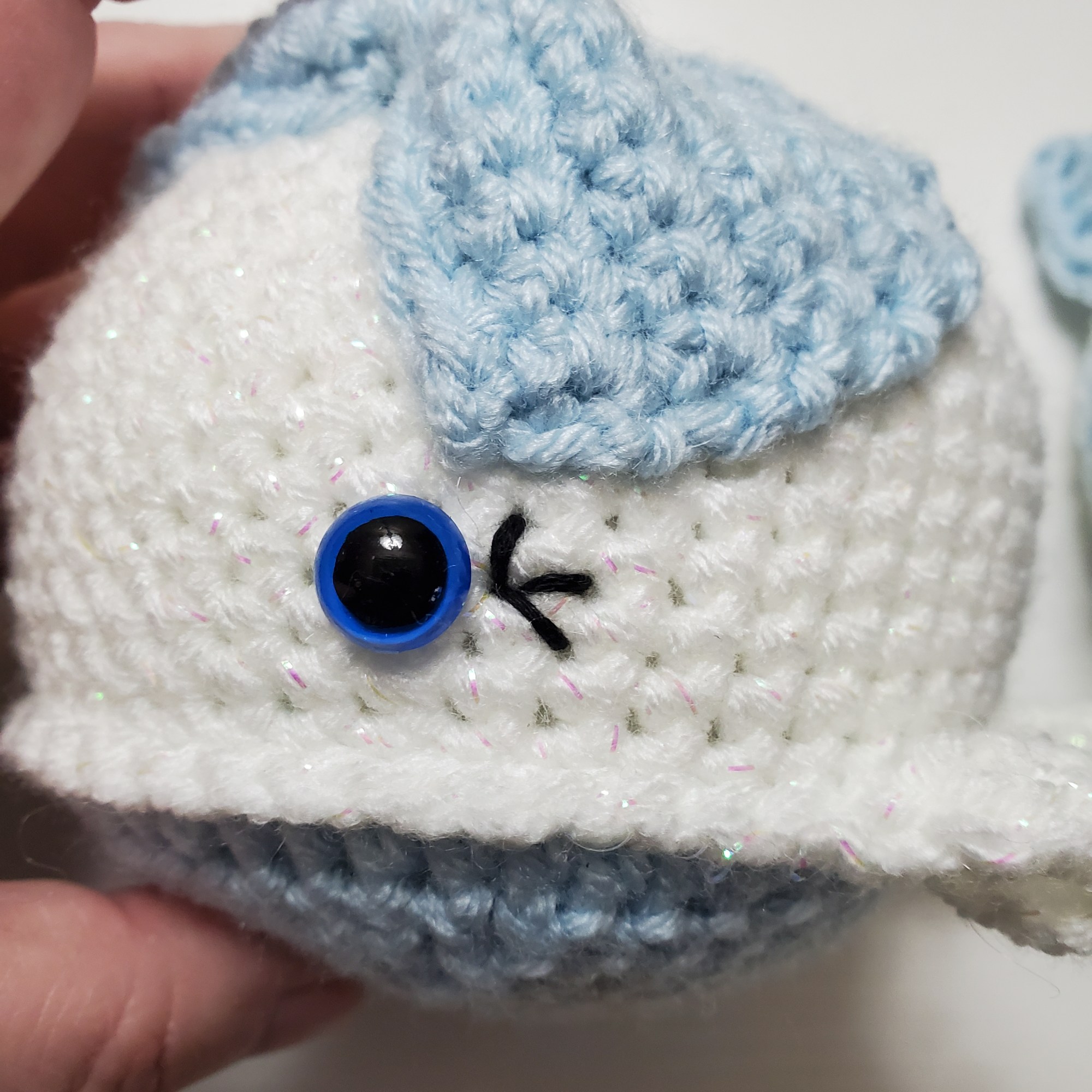 Then, just use the images below to recreate the eyelashes. They are just straight stitches. To do the opposite eye’s lashes, you may carry the thread over. But be careful not to pull tight and warp your whale’s face. To end, simply run the thread back out the bottom of the whale.