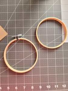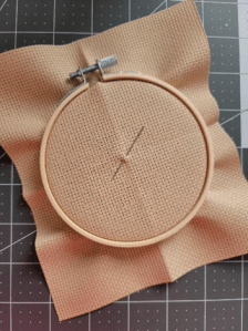 Next, gather your materials for today. You will need a piece of Aida that is larger than your hoop, your hoop, and a cross-stitch needle.