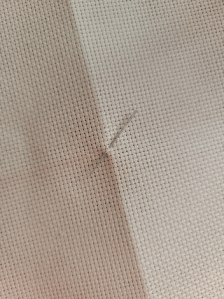 The center of the fabric is where the two fold lines meet. Do not worry that you have creased your fabric. The lines will come out as you stitch and when you iron as your final step. You can now insert your cross stitch needle into the holes of the square where the two lines meet and unfold your fabric.